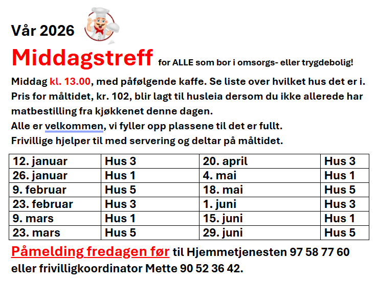 Middagstreffet er i omsorgsbolig måndag i oddetalsveker, og går på omgang mellom Hus 1, 3 og 5. Dette er for dei som bor i trygde- eller omsorgsbolig på Sørheim. Påmelding til frivilligkoordinator. tlf 90 52 36 42, eller til personal. Du betaler 102 kr for maten dersom du ikkje har bestilling på mat denne dagen.